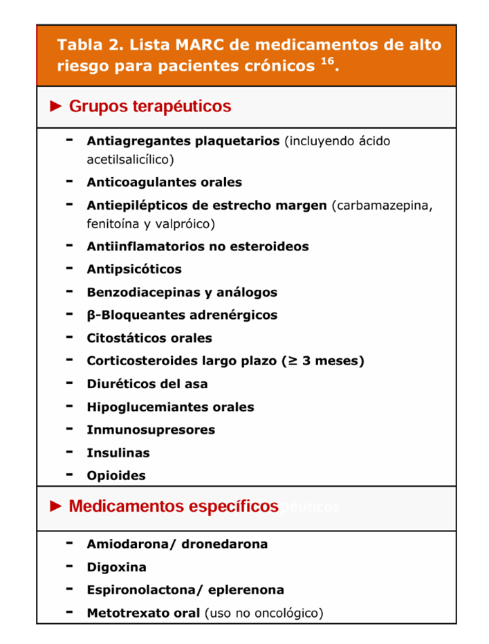 Proyecto MARC. Elaboración de una lista de medicamentos de alto riesgo para los pacientes crónicos. Madrid: Ministerio de Sanidad, Servicios Sociales e Igualdad, 2014: https://seguridaddelpaciente.sanidad.gob.es/informacion/publicaciones/otrosArticulos/docs/Proyecto_MARC_2014.pdf